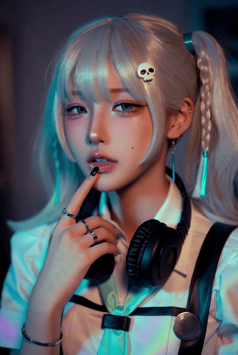 "描述": "一位年轻女性,采用精致的Cosplay肖像造型,铂金色双马尾,骷髅发夹,光泽双唇,眼神梦幻望向镜头外,脖子上挂着黑色头戴式耳机。",
