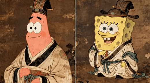身上穿着唐朝服饰的一只派大星,自然逼真,北宋时期风格油画暗棕褐色旧版图高清,精细工笔,精细流畅、柔韧有力、充满韵律感。衣纹的勾勒,疏密有致。用色典雅,善于运用对比色,丰富和谐,头戴唐朝帽子 来源:@op7418