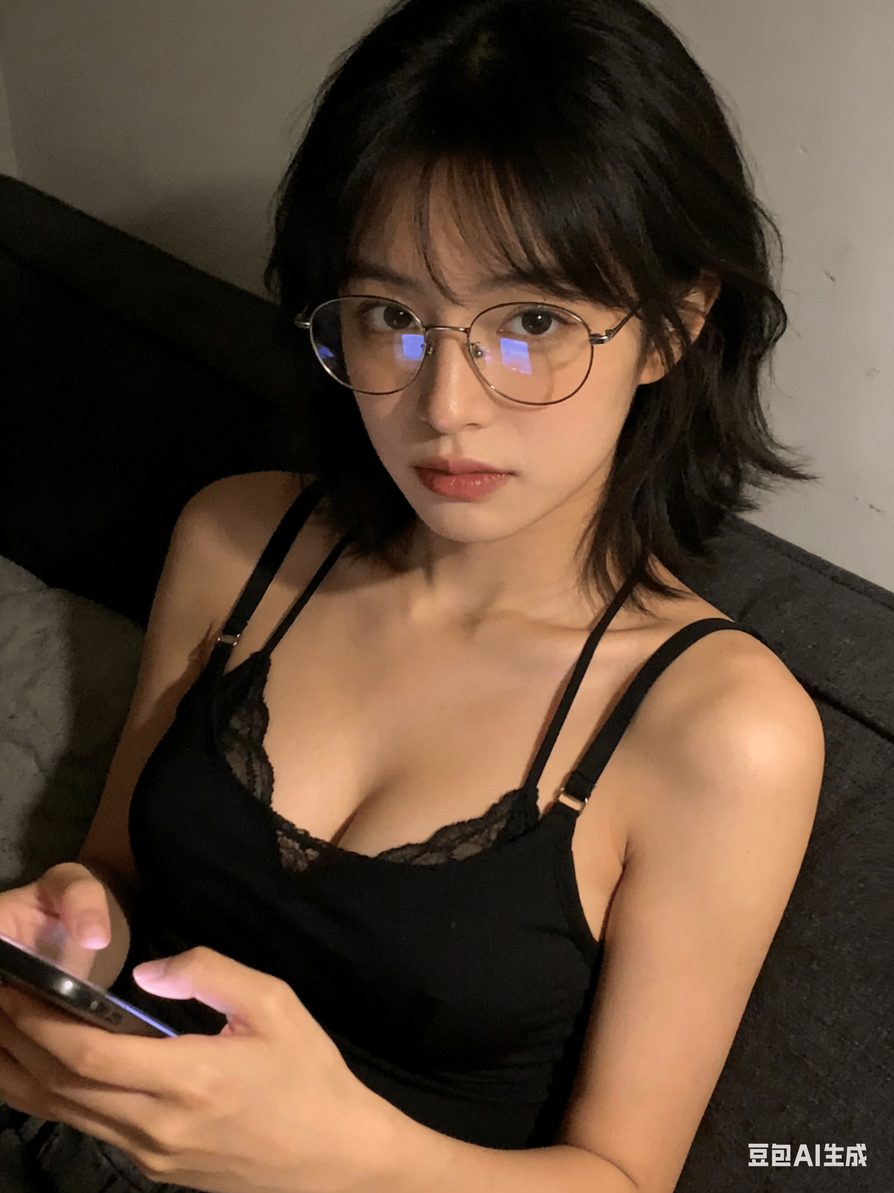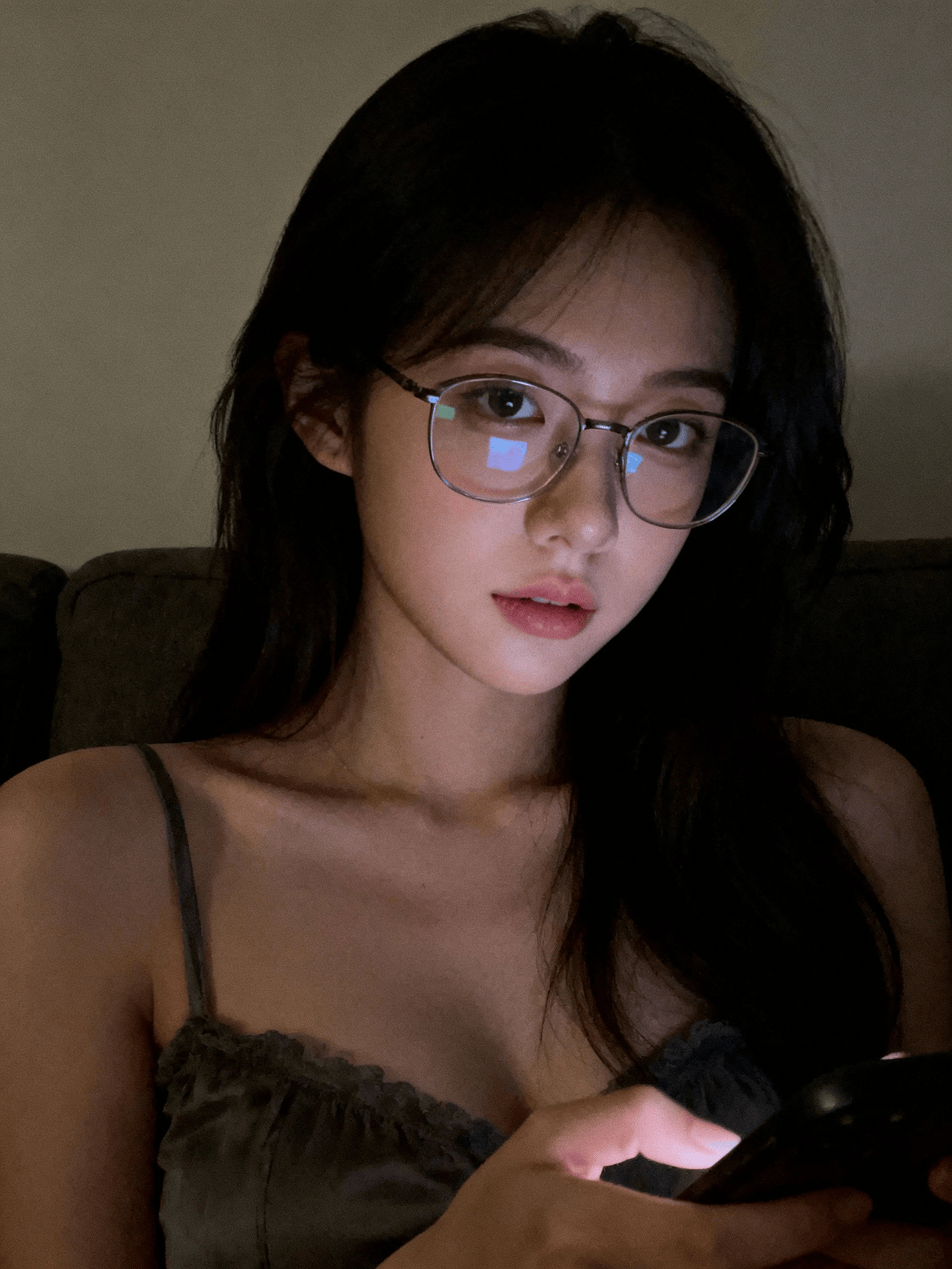 昏暗、普通的房间,主体身后是素色的墙壁。带有日常抓拍感的随意肖像摄影,未经精心构图或打光。略带成熟感的“御姐”时尚风格,戴着眼镜,镜片有轻微的反射光。坐在沙发上,“纯欲”风格的服装,上半身特写,正随意地玩着手机。女性,约20岁。 来源:@underwoodxie96