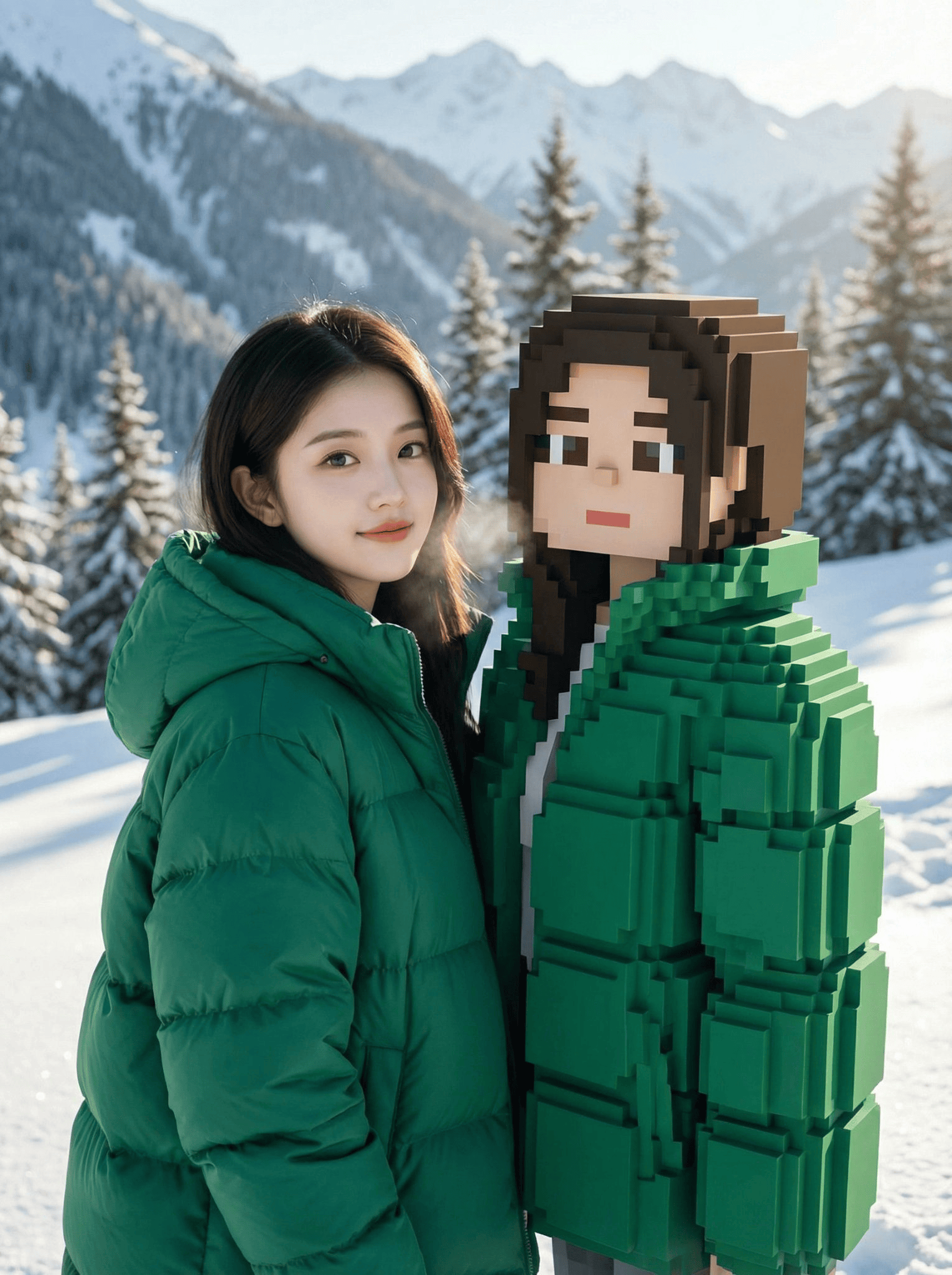 使用附加的参考图像创建一张逼真的照片,同一个人,身份完全保留,无面部变化。 这个人站在雪山上,没有戴太阳镜,穿着一件随机颜色的厚羽绒服。 在他旁边站着一个与真人等大的 3D《我的世界》风格角色版本,完全由积木(体素风格)构成,穿着完全相同的随机颜色羽绒服,与真实服装完美匹配。 光线具有电影感和自然感,有逼真的阴影和高光。 高分辨率,8K 画质。 真人采用照片级真实风格,而 Minecraft 角色则使用干净的体素艺术进行对比。 清晰对焦,专业调色。