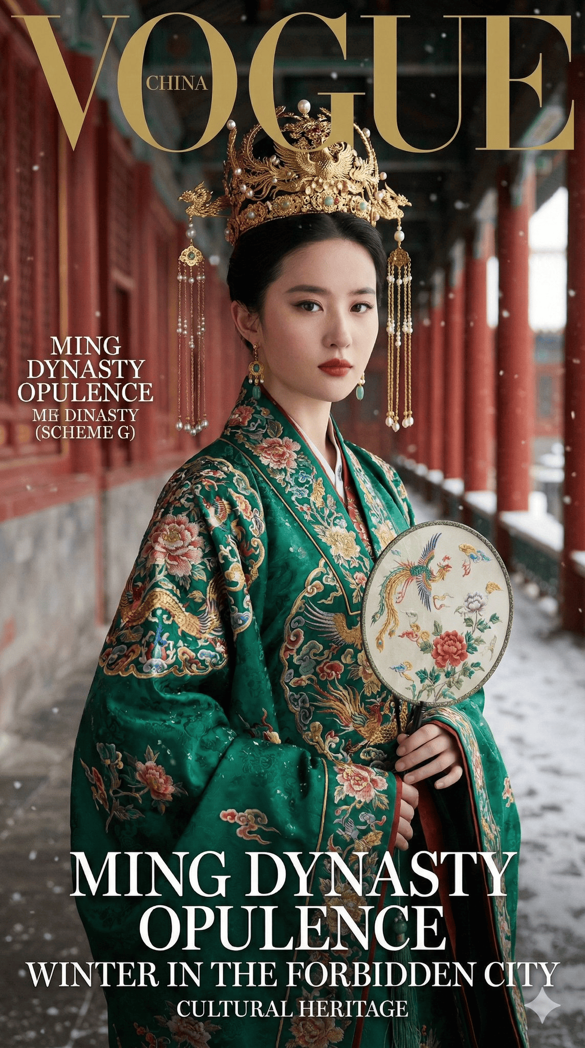 生成一张 9:16 竖版「高端时尚杂志封面级」写实照片:以我上传的 FACE_REF 为人物身份参考,100%还原五官与骨相;人物身穿“明制华丽礼服方向”的重工汉服(多层叠穿、手工刺绣/织金锦、贵重金饰头面),在故宫红墙长廊雪景中拍摄。画面具备《Vogue》《Harper’s Bazaar》《ELLE》《Cosmopolitan》《Marie Claire》《i-D》《Allure》《FLAUNT》级别的摄影、造型与封面设计,以上杂志随机任选一作为杂志的封面设计,并保持选择杂志的一贯设计风格(中英文设计)