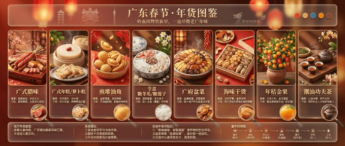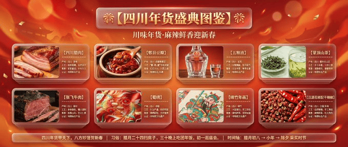 年货寓意:“[地点]年货甲天下,八方珍馐贺新春”