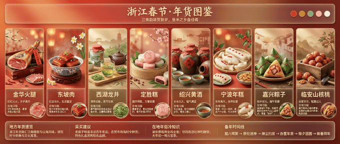 创建一幅超宽信息图海报,标题为“[地点]年货盛典·琉璃珍宝匣图鉴”。