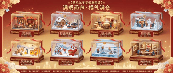 风格:3D琉璃珍宝匣·收藏级博物馆美学——将来自[地点]的8种本地特色年货封装于精美的3D半透明琉璃礼匣中,宛如国家级博物馆数字春节特展的杰作。