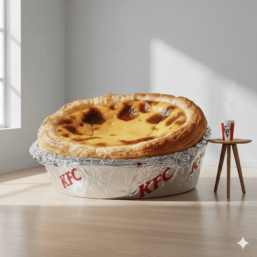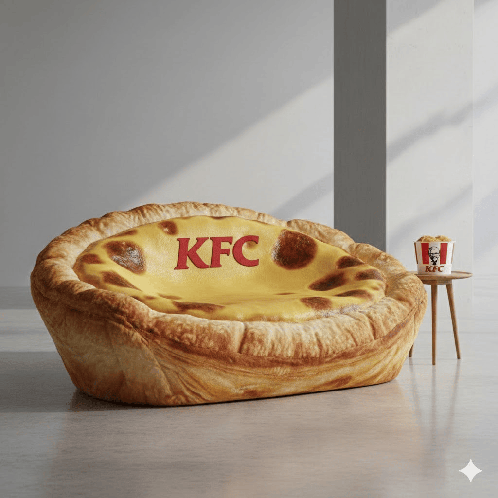 超写实产品摄影:一张巨大的KFC蛋挞沙发,完美复刻经典葡式蛋挞造型,并设计为功能性家具。沙发表面呈现焦糖化色泽与烘烤斑点,侧边采用褶皱面料模拟层层酥皮纹理,座位区有柔和的凹陷设计。沙发置于现代极简风格的客厅中,背景为浅灰色墙壁与木地板。左侧的窗户透入柔和光线,在天鹅绒般质感的表面形成温暖高光。旁侧摆放一张小边几,上面有一杯KFC红色咖啡杯。采用专业产品摄影布光,浅景深,超精细纹理渲染,商业广告风格。温暖、诱人食欲的色调。8K分辨率,影棚级画质。