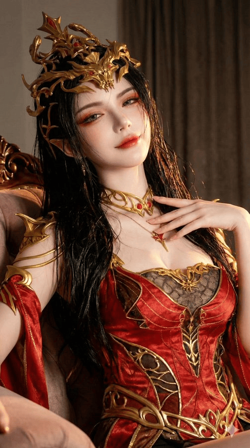 "配饰": "繁复金丝王冠(龙/凤纹饰),精灵耳(风格化版本中可选)"