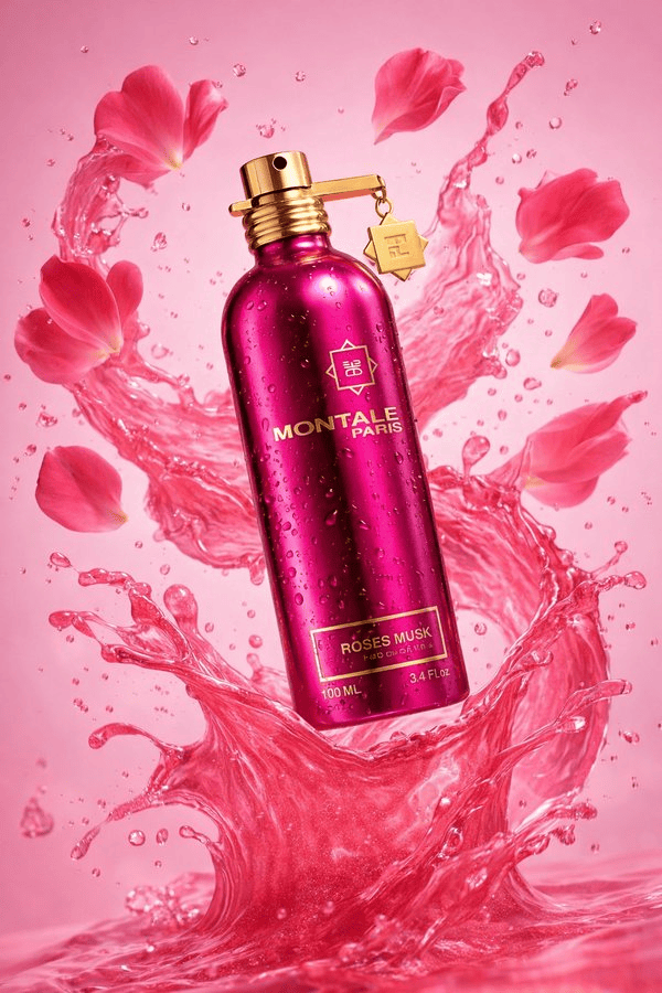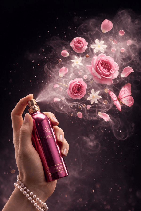 "景深层次": "前景手部,空中喷雾与花朵,暗色背景"