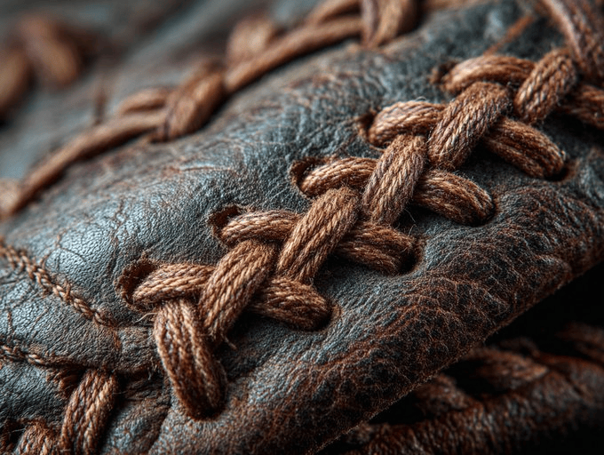 **[产品]** 复古棒球手套缝线,可见单根线材纤维,工匠精度,织物地貌,品质证明,编织图案如抽象艺术,柔和定向光线。