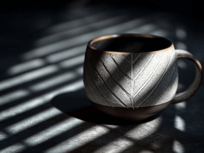 [产品] 上投射着由 [百叶窗、穿孔屏风、建筑构件] 形成的戏剧性几何阴影,光与暗的交织,图案叠加,暗示一天中特定时段的时光感,忧郁而精致的氛围。