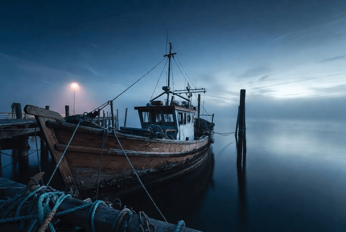 3.  黎明时分渔船系泊在码头的广角镜头,35毫米变形宽银幕镜头拍摄,柔和的黎明前蓝光与一盏孤立的码头灯光,对焦于饱经风霜的船体,浓厚的海雾弥漫,以不饱和的蓝色调为主,点缀着温暖的钠灯光,藤壶与剥落的油漆细节清晰。