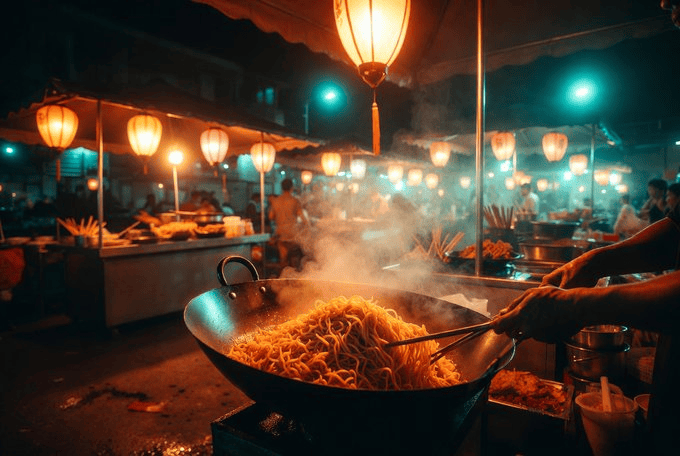 1.  夜市小吃摊广角镜头,35毫米镜头拍摄,暖色顶光灯笼照明,浅景深,蒸汽氤氲的氛围,橙青色调,摊贩的手正在锅中翻炒面条。