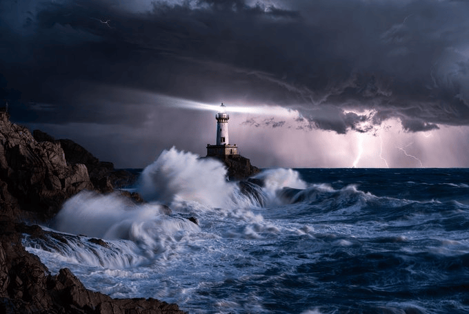 4.  暴风雨海景中的灯塔,具有戏剧性的透视感和汹涌的海浪,传达出孤立与坚韧。