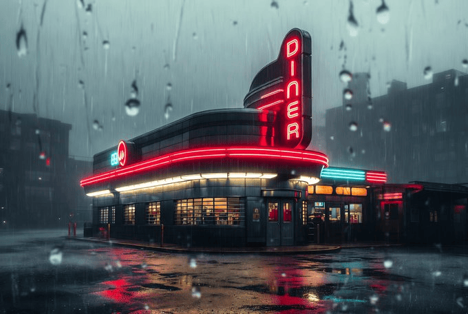 2.  一家废弃的复古未来风格餐厅中景,霓虹灯在暴雨中闪烁。中焦定焦镜头拍摄,霓虹灯光(红色、蓝色)在昏暗的环境光中形成鲜明对比,浅景深模糊了背景街道,氛围忧郁、舒适,略带感伤。