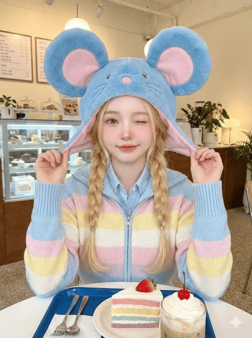 戴着一顶过大的蓝色毛绒老鼠帽,帽子上有着巨大的圆形耳朵,粉色耳边,还有一个小小的粉色鼻子