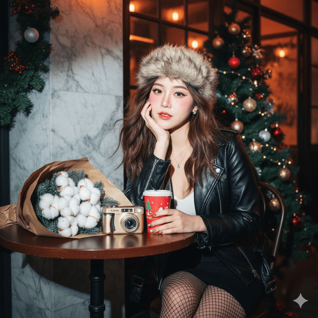 场景位于一家大理石灰色外墙的咖啡馆前,装饰着圣诞主题元素。包括一棵逼真的圣诞树、松枝装饰品和节日挂饰。