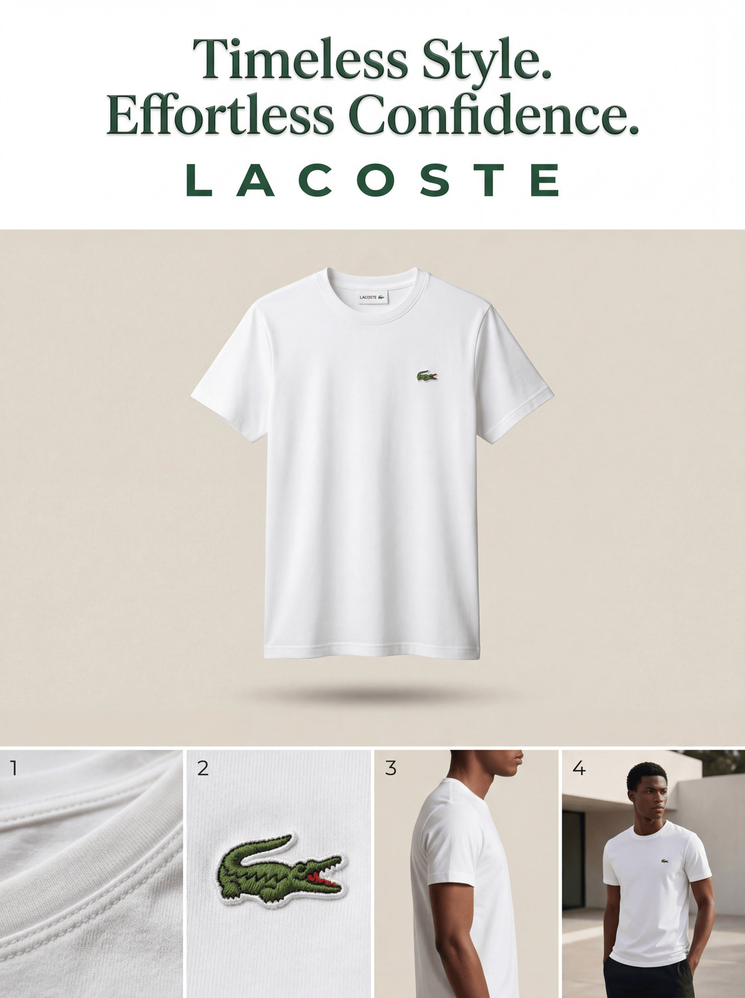 "目标": "创建一张高端3:4 Lacoste T恤广告,顶部为艺术标语,下方为品牌名,上半部分为大幅产品主图,下半部分为2×2网格展示多角度与品牌细节。",