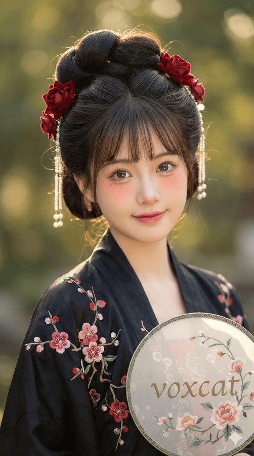 提示: 顶级中式古风人像摄影,竖版9:16,特写镜头,[人物] 18岁绝美中国古代贵族少女,甜美无辜、如人偶般的精致容颜,[特征] 柔和的椭圆形娃娃脸,面中短,大而圆的杏仁眼带有明显眼神光,目光闪亮灵动,小而饱满的娇嫩红唇,[发型] 高耸繁复发髻搭配空气刘海,点缀艳丽的红丝绒花朵与珍珠流苏,发丝如绸,[服饰] 玄黑色丝绸长袍,饰有鲜艳梅花苏绣,[妆容] 瓷白奶油肌,眼下明显的桃粉色腮红(微醺感),可见楚楚动人的卧蚕,莹润渐变唇,[光线] 大型柔光箱正面光,无硬影,头发处有温暖金色轮廓光,[场景] 手持圆形丝扇,背景为绿金色温暖极致虚化光斑,[技术] 8K超写实画质,85mm f/1.4镜头,梦幻氛围,高级汉服美学 ——无硬阴影、刺眼光线、哑光唇色、杂乱背景 ——比例 9:16