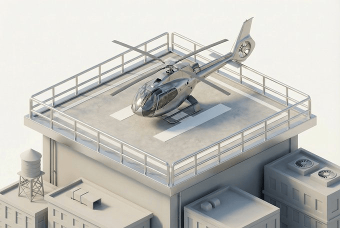 一个简洁、极简的3D等距视角微缩场景:屋顶直升机停机坪。场景包含一架停放在标线清晰的起降平台上的现代直升机、安全护栏、细腻的城市背景细节。采用柔和影棚灯光,材质真实,边缘平滑,呈现微缩模型风格,细节丰富,背景中性。
