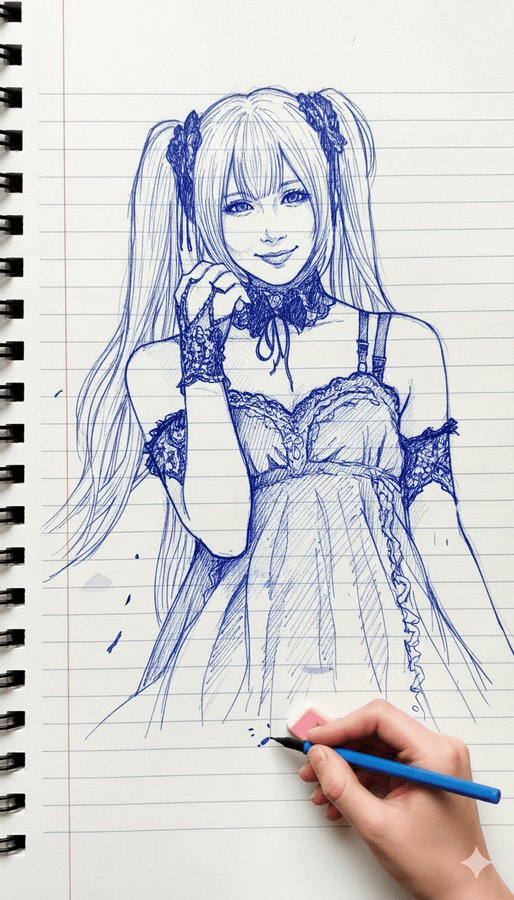 创建与上传的参考图像相同的照片风格线条画/墨水素描面部——保持每个面部特征、比例和表情完全相同。 使用蓝色和白色墨水色调,在笔记本页面风格的背景上绘制复杂、细腻的线条细节。 在草图附近画出一只拿着笔和橡皮的右手,就好像艺术家仍在工作一样。 来源:@songguoxiansen