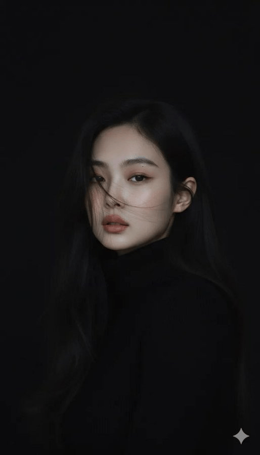 忧郁电影感肖像,一位年轻女子,肤色白皙清透,近乎无妆,双唇呈现自然暖色调。深棕色长发松散披肩,质感柔和。神情沉静自信。身着合身黑色高领毛衣,线条简洁,低调优雅。暗调极简背景渐隐入黑色。柔和的漫射正面光,浅淡阴影,细微胶片颗粒,有机色彩分级,浅景深,呈现高端编辑感。