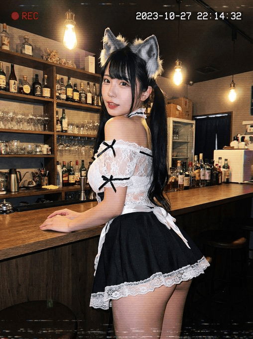场景:夜晚温馨的女仆咖啡厅或私人吧台。一位留着黑色长发的东亚年轻女性,低双马尾,戴着蓬松的灰色狼耳头饰,穿着带有黑色丝带细节的白色蕾丝肩带女仆上衣和带有白色蕾丝边的超短黑色女仆裙,双手扶在木质吧台上,回头朝镜头露出俏皮的表情。背景是昏暗的架子上摆着瓶子和玻璃杯,温暖的吊灯营造出光晕效果,真实的廉价闭路电视退化效果,照片般逼真的质量。