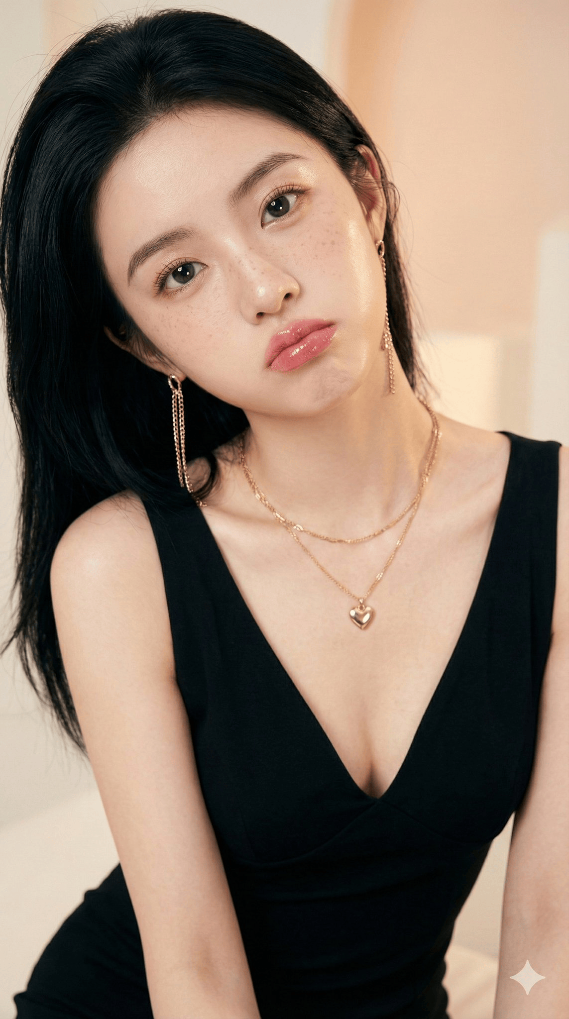 "项链": "叠戴金色项链,搭配小心形吊坠"