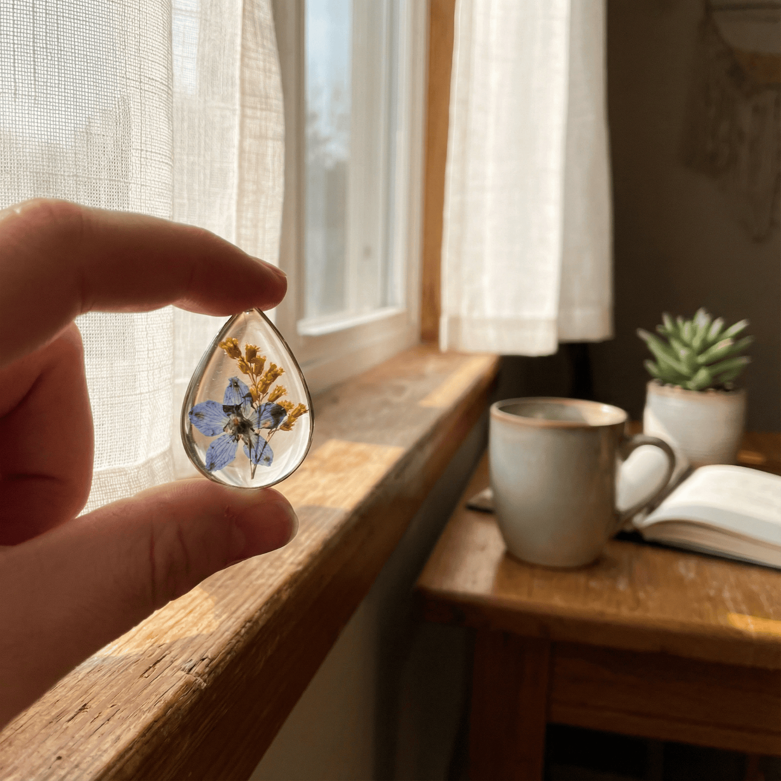 压花树脂吊坠置于柔和晨间场景中,金色晨光透过薄纱窗帘洒入,呈现私密生活瞬间,充满向往感的清晨氛围,慢生活美学。