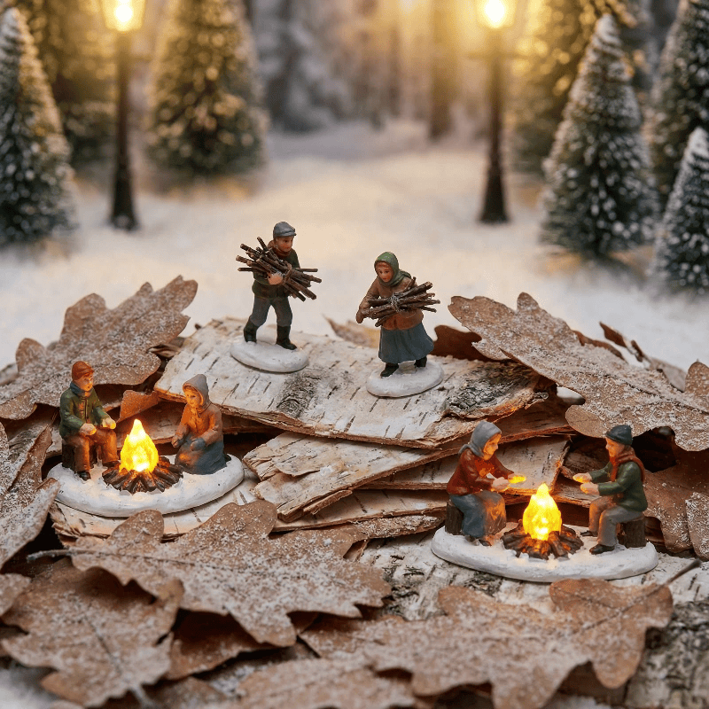 微缩场景: 微小的人们 [收集柴火并围着小火堆暖手] ,以 [堆叠的树皮碎片与干枯落叶] 为景,背景为冬日森林,透着柔和的金色光线。画幅比例 1:1。