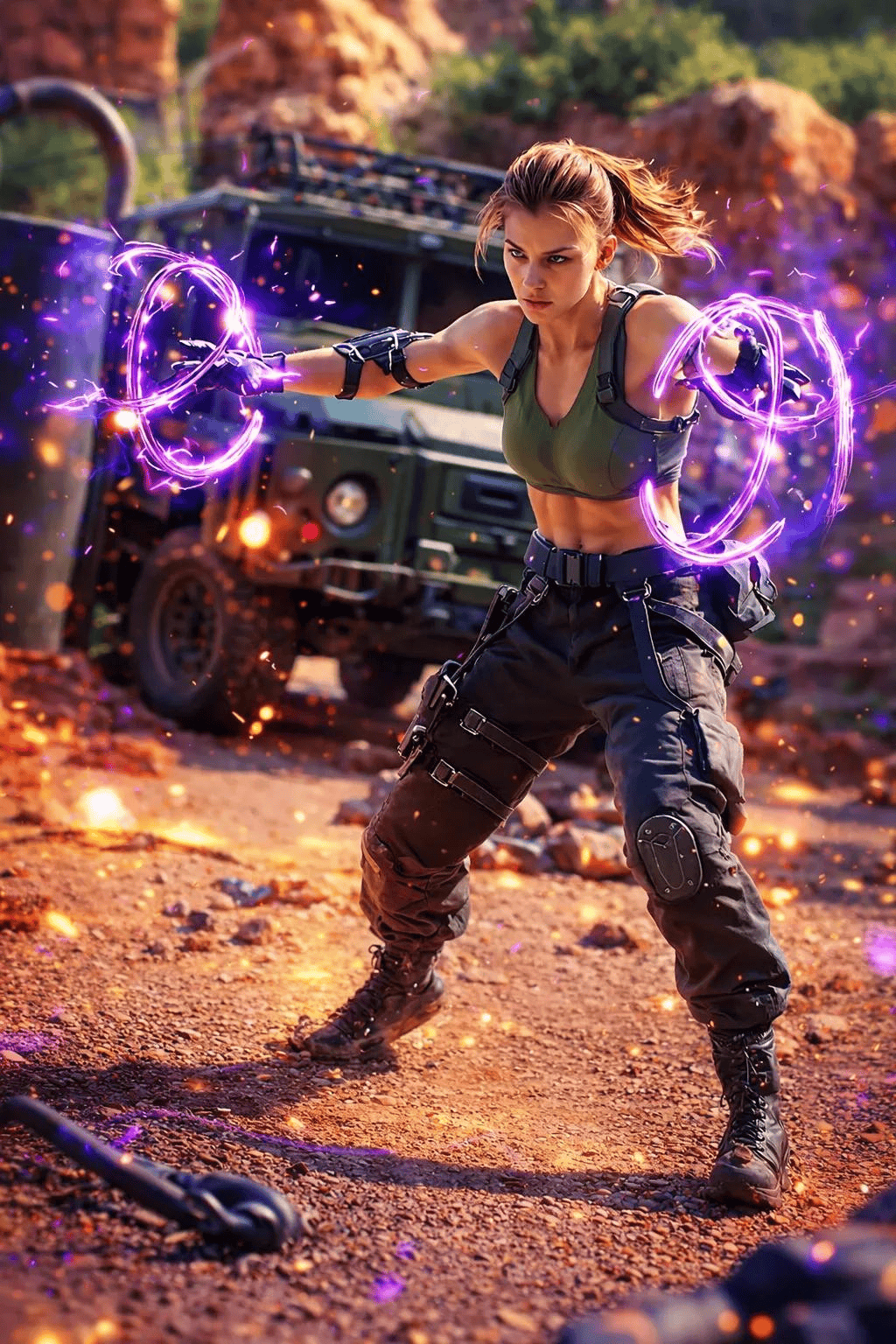 一位强大的运动型女战士站在岩石战场上,穿着战术战斗裤、战斗靴和军用风格短款上衣。她的双臂向前伸出,双手周围盘旋着发光的紫色能量环,带有电火花和粒子。她脸上表情专注紧张,风吹拂着她的马尾辫。背景显示一辆军用吉普车和崎岖地形,浅景深。电影级照明,戏剧性的阴影,超真实皮肤纹理,锐利焦点,动态动作姿势,高细节视觉特效能量效果,好莱坞超级英雄电影场景,8K分辨率,超现实主义,电影级色彩分级,运动模糊粒子,史诗氛围。