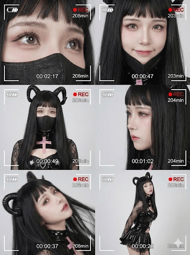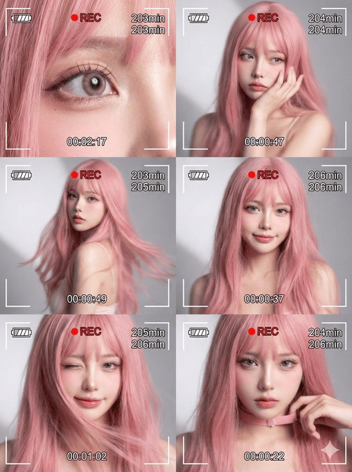 这是一组六宫格的电影感拼贴肖像,呈现同一位**[附件的年轻女性,改成粉色长发]。整体风格呈现 Z 世代未来主义美学,具有梦幻、缥缈的氛围感和轻微的抖动模糊效果。每一帧画面都设计为数字摄像机(DV)录制界面**,并带有屏幕叠加元素:电池图标、红色“REC”录制标志、白色计时器(数值分别为 00:02:17, 00:00:47, 00:00:49, 00:01:02, 00:00:37, 00:00:22)以及剩余分钟数(203min–206min)。