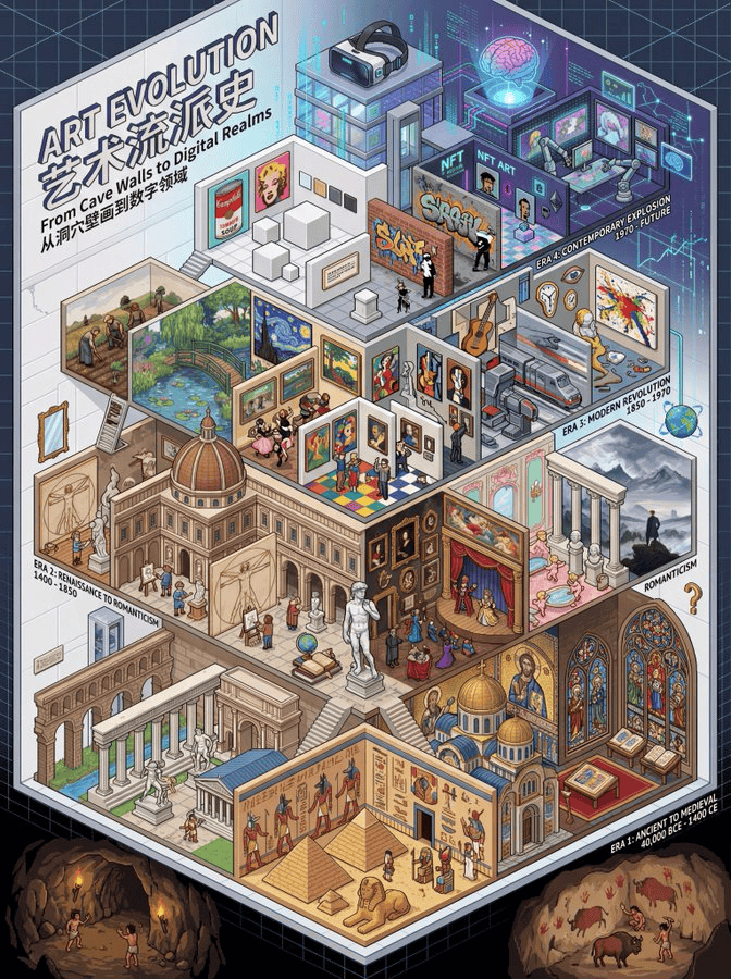创建一幅高度细节化的等距像素艺术插画,展现艺术运动历史时间线,采用3:4宽高比及4K分辨率。这幅插画应是一幅复杂、象征性且充满隐喻的等距像素艺术,配有双语标题,聚焦人类从洞穴壁画到当代表达的艺术演进。