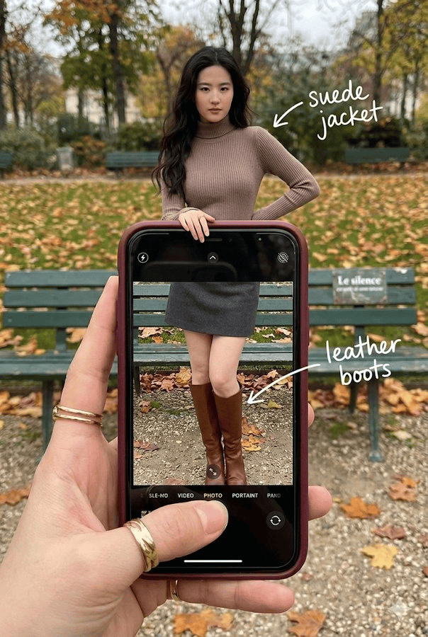 {"文字": "麂皮夹克", "指针": "箭头指向上半身"},