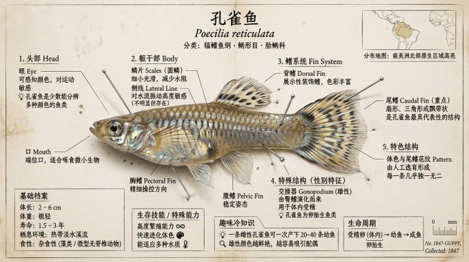 整体:如同博物馆玻璃展柜中的鱼类标本说明牌