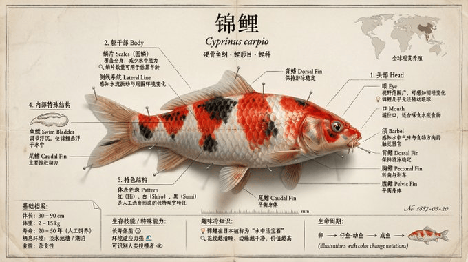 请创建一张博物馆展品级别的鱼类知识科普图谱,聚焦展示【某一种代表性鱼类,如:金枪鱼 / 鲤鱼 / 鲨鱼 / 小丑鱼(可替换)】。