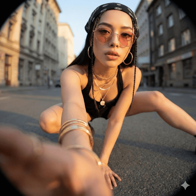 * 最终结果必须看起来像是一张大胆的时尚或街头照片,完全写实,而非插画或动漫。
