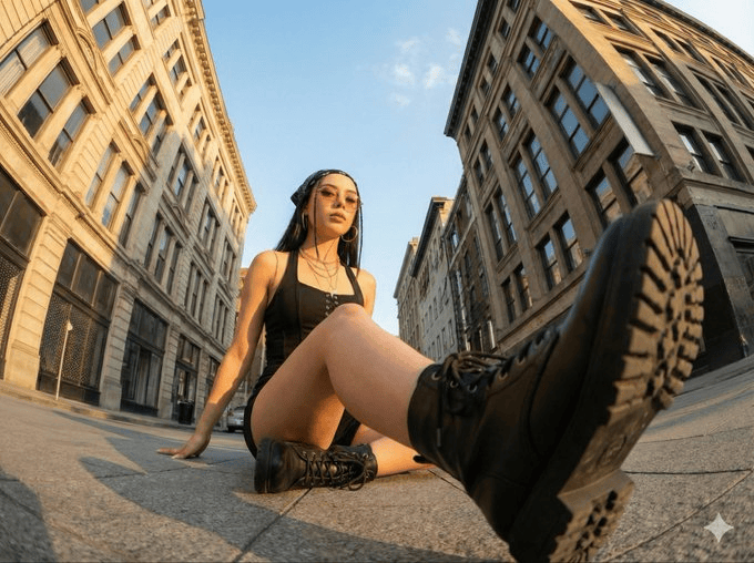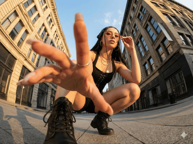 将原始照片转变为一张具有极端相机角度(包括从正下方或正上方观看)的戏剧性、写实、超广角照片,其中一个或多个身体部位紧贴镜头并显得巨大,身体其余部分在透视中后退,同一人物在原始环境的一致扩展版本中摆出时尚、复杂、有力的姿势。
