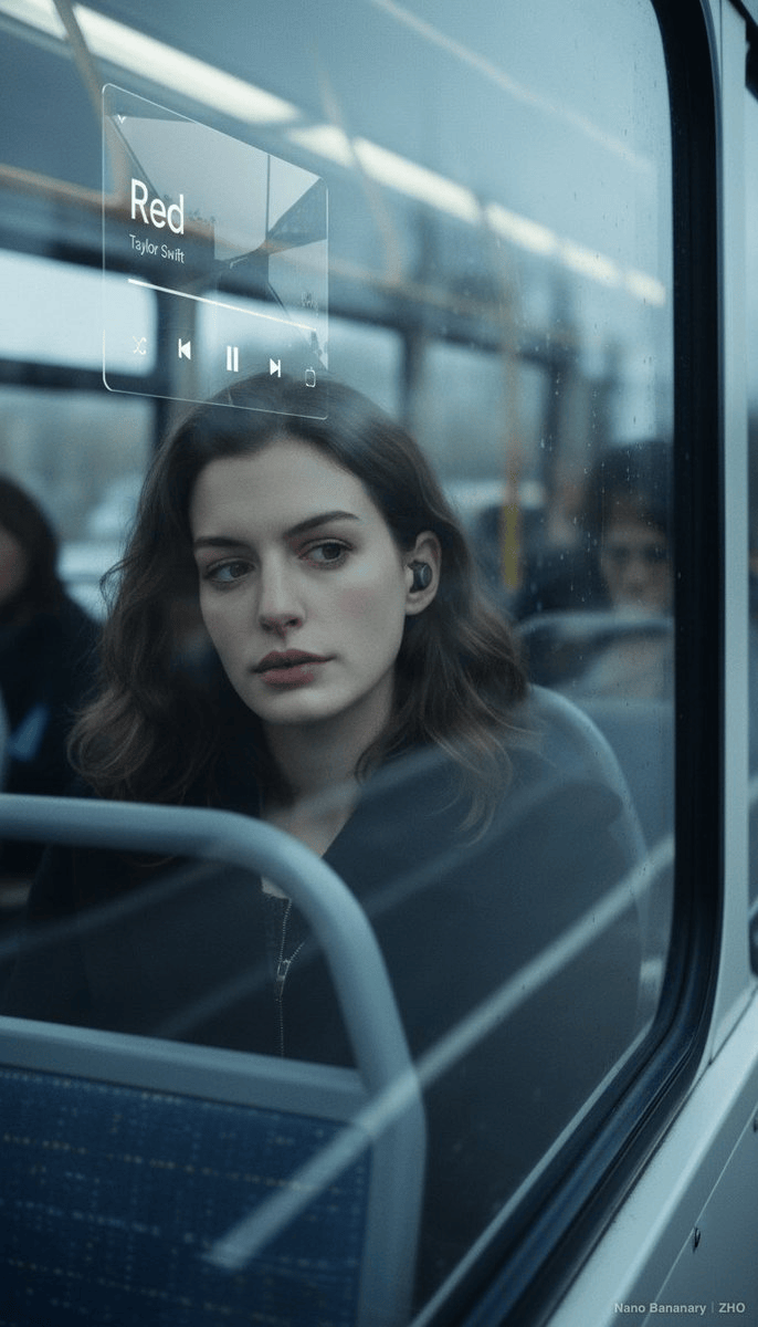"描述": "通过将一个主体(基于参考照片)置入新的氛围背景中,并叠加一个音乐用户界面,来创建一个新场景的提示。",