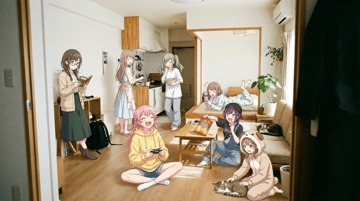 为这个写实的实景场景房间添加多位性格各异的动漫风格女孩,正在举办一场热闹的居家派对,确保房间是写实风格,只有少女为动漫风格。