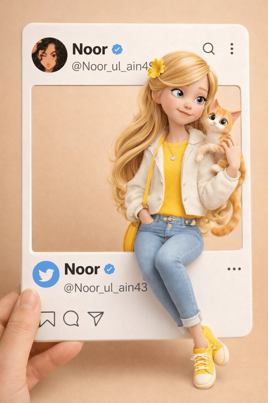 一位可爱的、超精细3D卡通女孩,采用皮克斯/迪士尼风格,自然地坐在一张X(Twitter)个人资料卡的下边缘,从个人资料框里浮现出来。