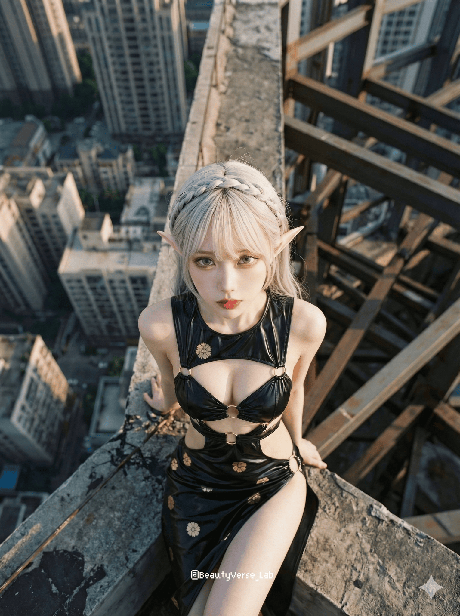 "提示词": "电影感静帧,**极端俯视的中景镜头**。女性位于画面正中心,**直视镜头,眼神充满强烈接触感**。她的身形突出,占据了画面的主要部分。**忠实复现参考图中的确切发型、服装及配饰**。她坐在最高摩天大楼的边缘。屋顶环境呈现粗糙的混凝土纹理和凌乱的钢结构。下方远处,模糊的城市建筑营造出一种令人眩晕的城市眩晕感。**戏剧性的温暖自然日光,高对比度,阳光反射在她的眼睛中**。工业感的哑色调,可见的胶片颗粒,柯达Portra 800胶片美学。超精细,面部和眼睛锐利聚焦,8K写实感。 --ar 3:4",