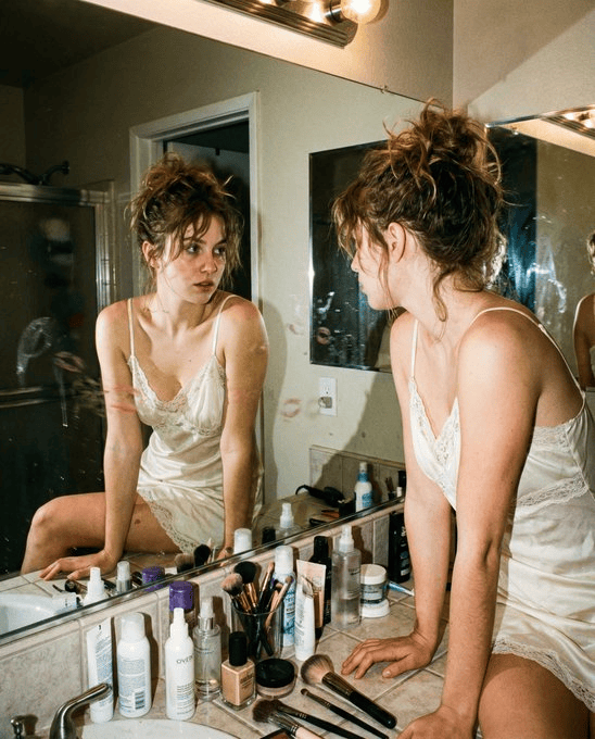 "姿势": "随意坐在浴室柜台上,身体前倾靠近镜子,腿部放松或交叉",