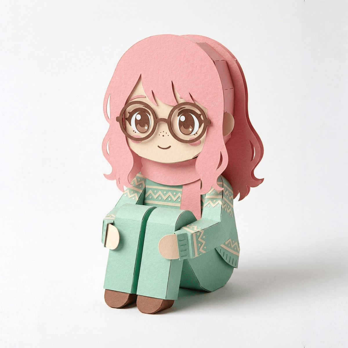 组装好的三维纸模。Q 版角色,高 2-3 个头身。发型、发色、服装和配饰均根据输入图像再现。纸张纹理、折痕、圆角和手工制作的温暖感。构图和光线适合产品推广摄影。