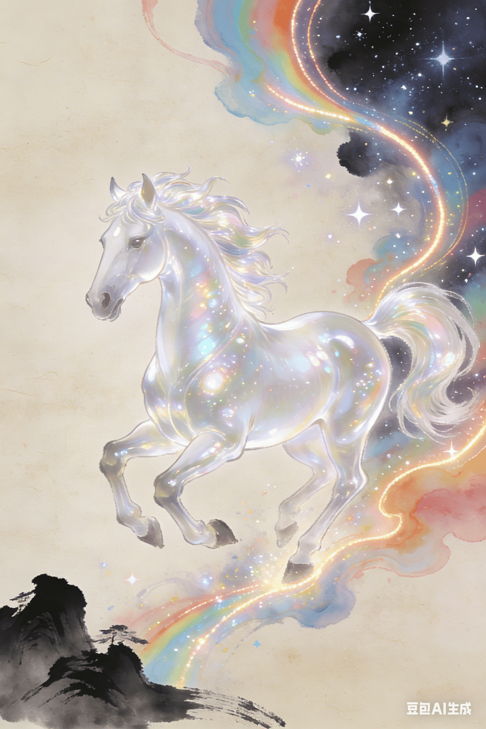 杰作,新中式水墨与梦幻星空结合风格,细节丰富,一匹通体透明、带有虹彩珍珠光泽的白色骏马,呈奔跑姿态,鬃毛与尾巴飘逸灵动,周围环绕着流动的彩虹辉光线条,强发光边缘、闪烁的星星和彩色水墨烟雾,背景是浅米色宣纸质感的底色,左下角点缀着黑色的水墨山水剪影,整体画面融合东方写意与奇幻色彩,柔和渐变色彩,细腻光泽质感,充满仙气与动感,色彩层次丰富,氛围梦幻治愈