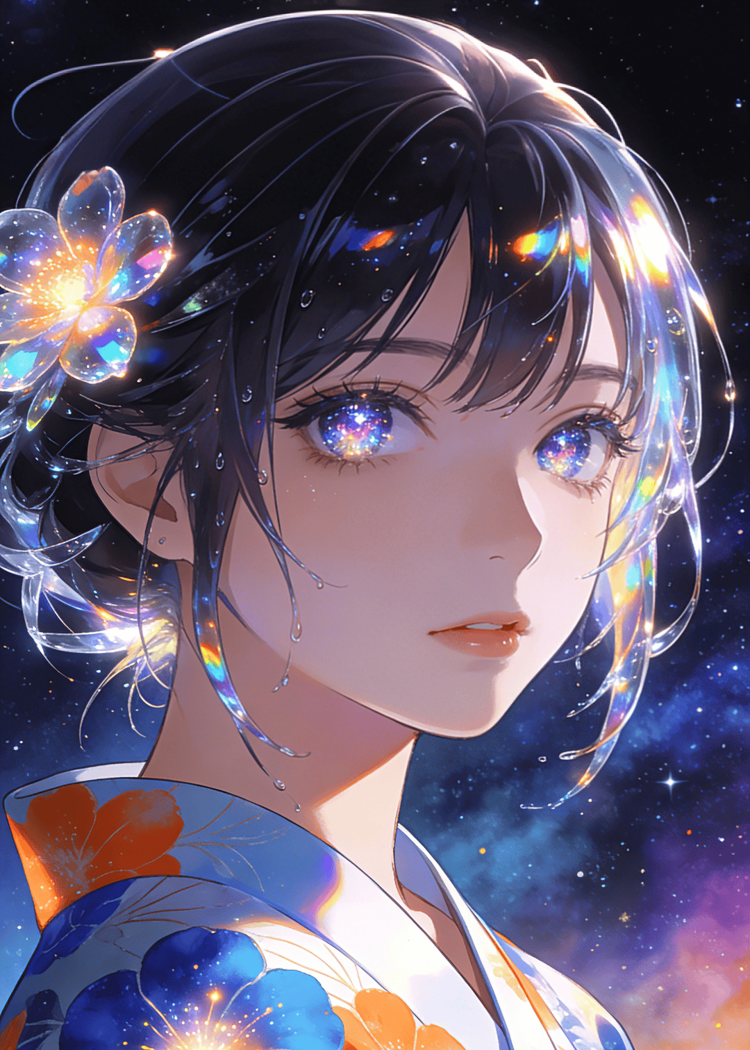 超精细动漫肖像,少女眼中映出璀璨星云,湿润发丝上呈现棱镜光晕与镜面高光,浴衣上的蓝橙色花朵绽放光芒,神秘而光辉的氛围,(空灵光辉:1.5),(光线反射:1.3)。