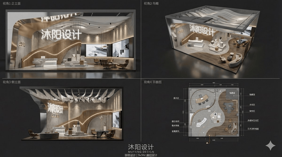 创建【沐阳环保】品牌的现代艺术感展览展位专业设计展板,【环保】行业,【展位尺寸9×18米】。要求在一张完整画面中展示4个视角,采用专业设计排版布局: