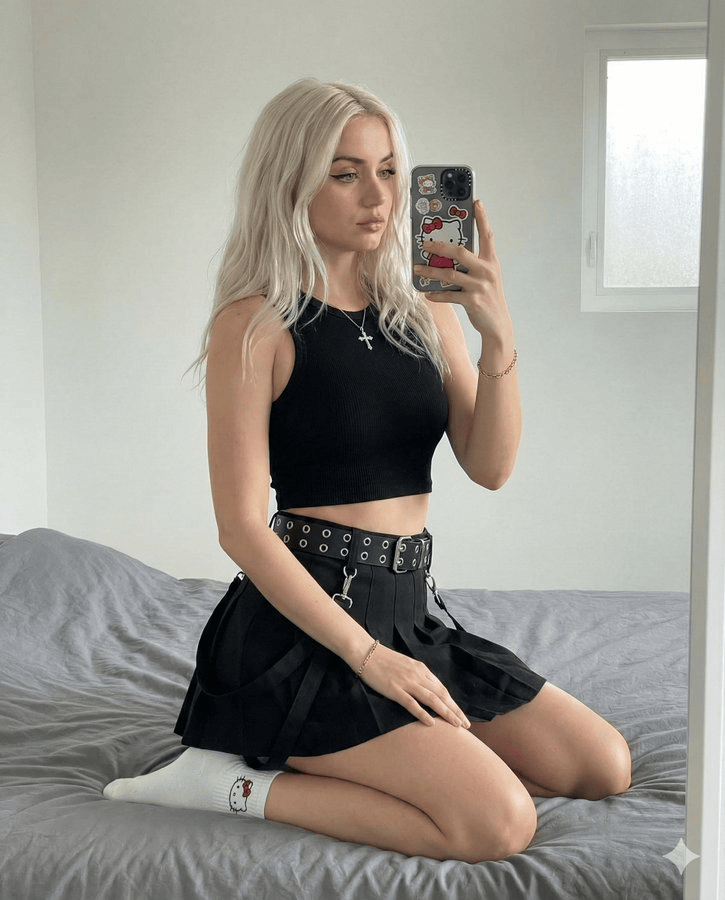 "bottom": "黑色百褶迷你裙,搭配哥特风金属孔腰带和垂挂带",