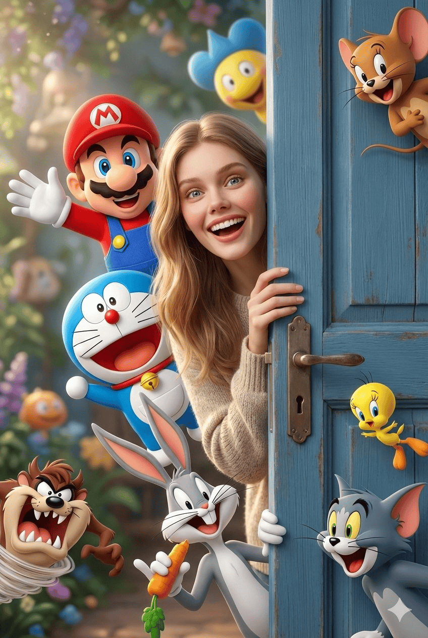 "interaction": "身旁有标志性卡通角色欢快地蹦出围绕",