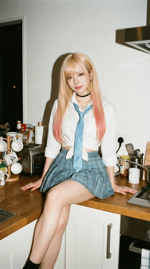 "姿势": "随意坐在木质厨房台面上的姿势,放松且不做作,与参考图像的自然姿态保持一致。",
