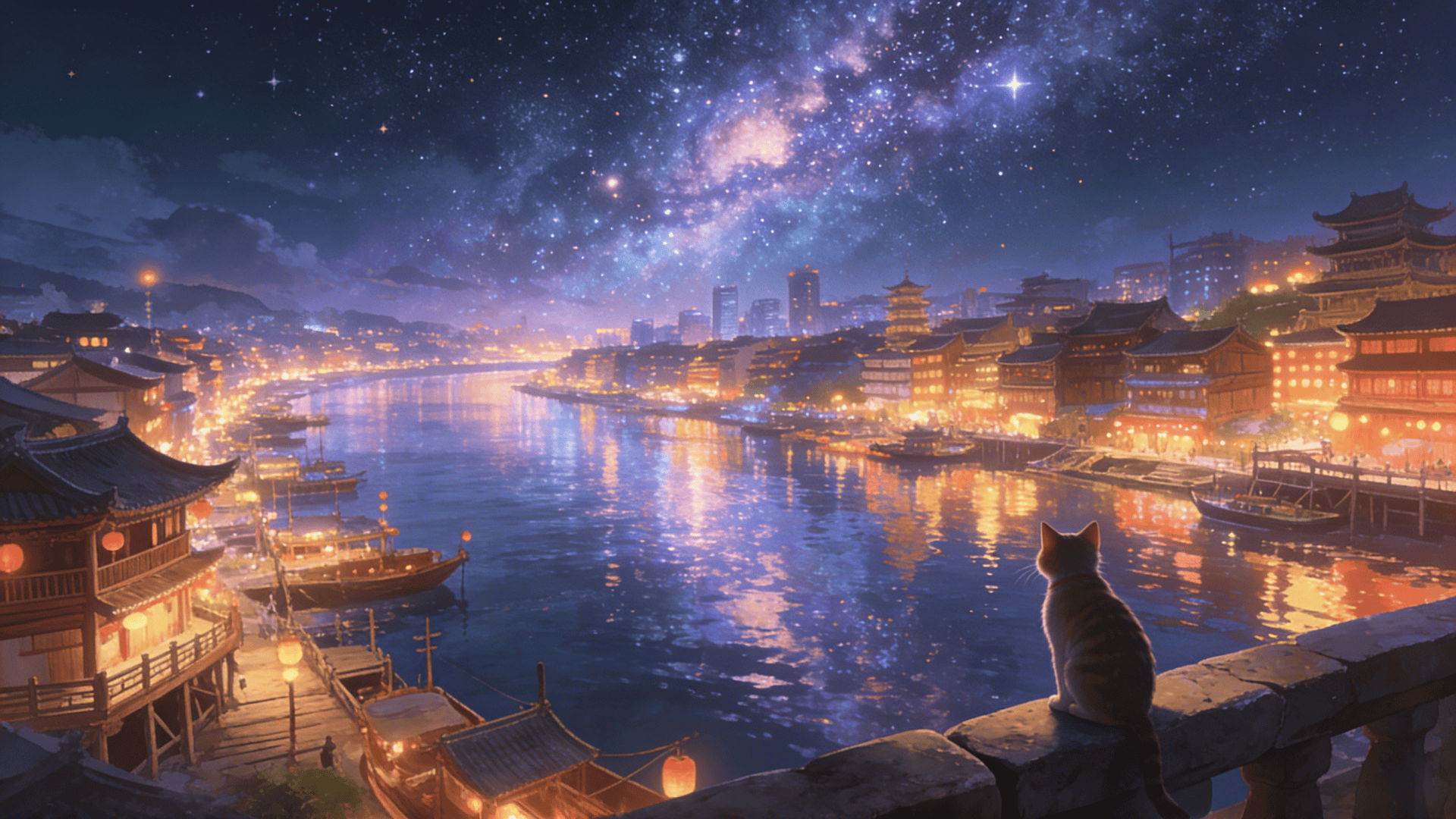 璀璨银河,灯火通明的繁华中式木制河港古城,波光粼粼的宽阔河面倒映星空与城市,右下角一只猫的背影站在石栏上眺望,吉卜力风格,新海诚风格,中国风奇幻插画,电影感,3D渲染,色彩艳丽,高饱和度,高对比度,广角镜头,三分法构图,超精细细节,8K,大师之作