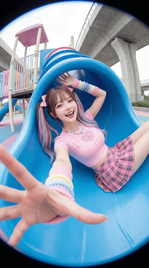 创作超现实摄影作品:一位女性在明亮的蓝色游乐场滑梯内部,采用极端广角鱼眼镜头,具有强烈的透视变形效果。